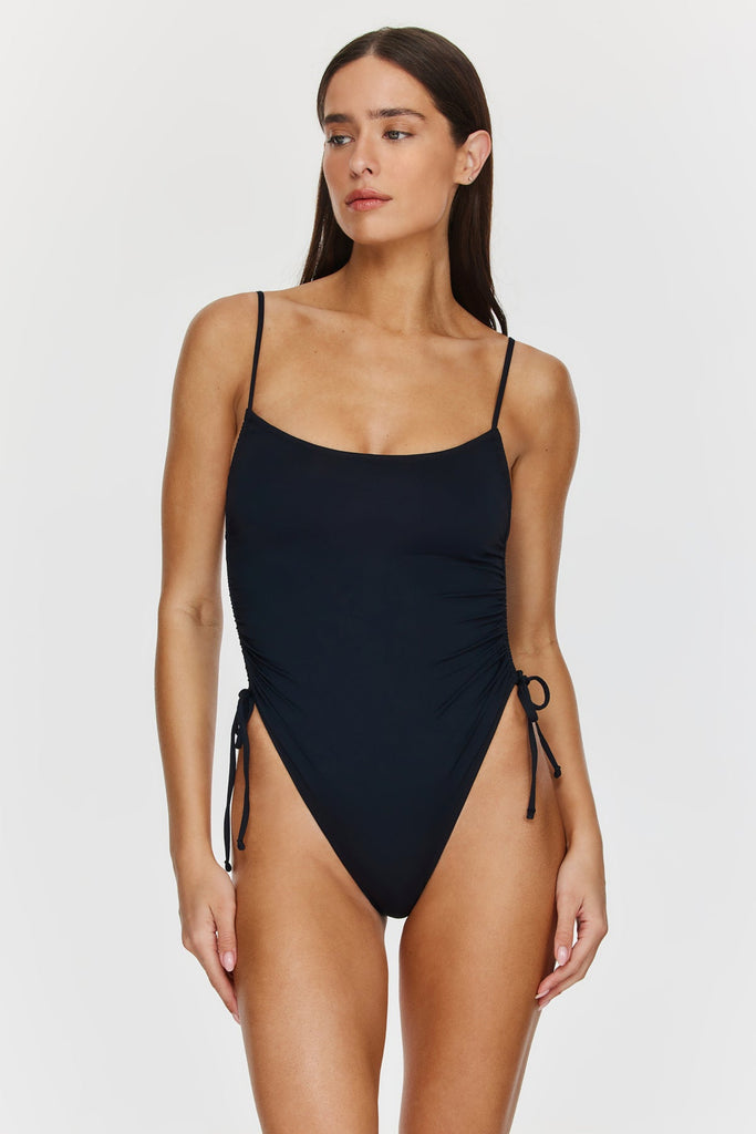 Black, one-piece, high- leg swimsuit with flattering side ruching and thin straps