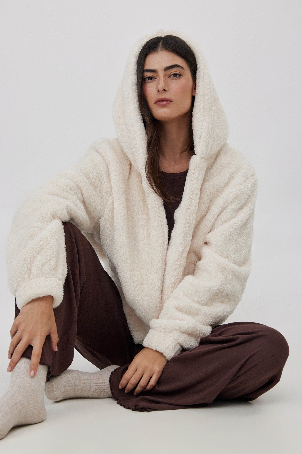 Short fleece jacket with front zip and hoodie.