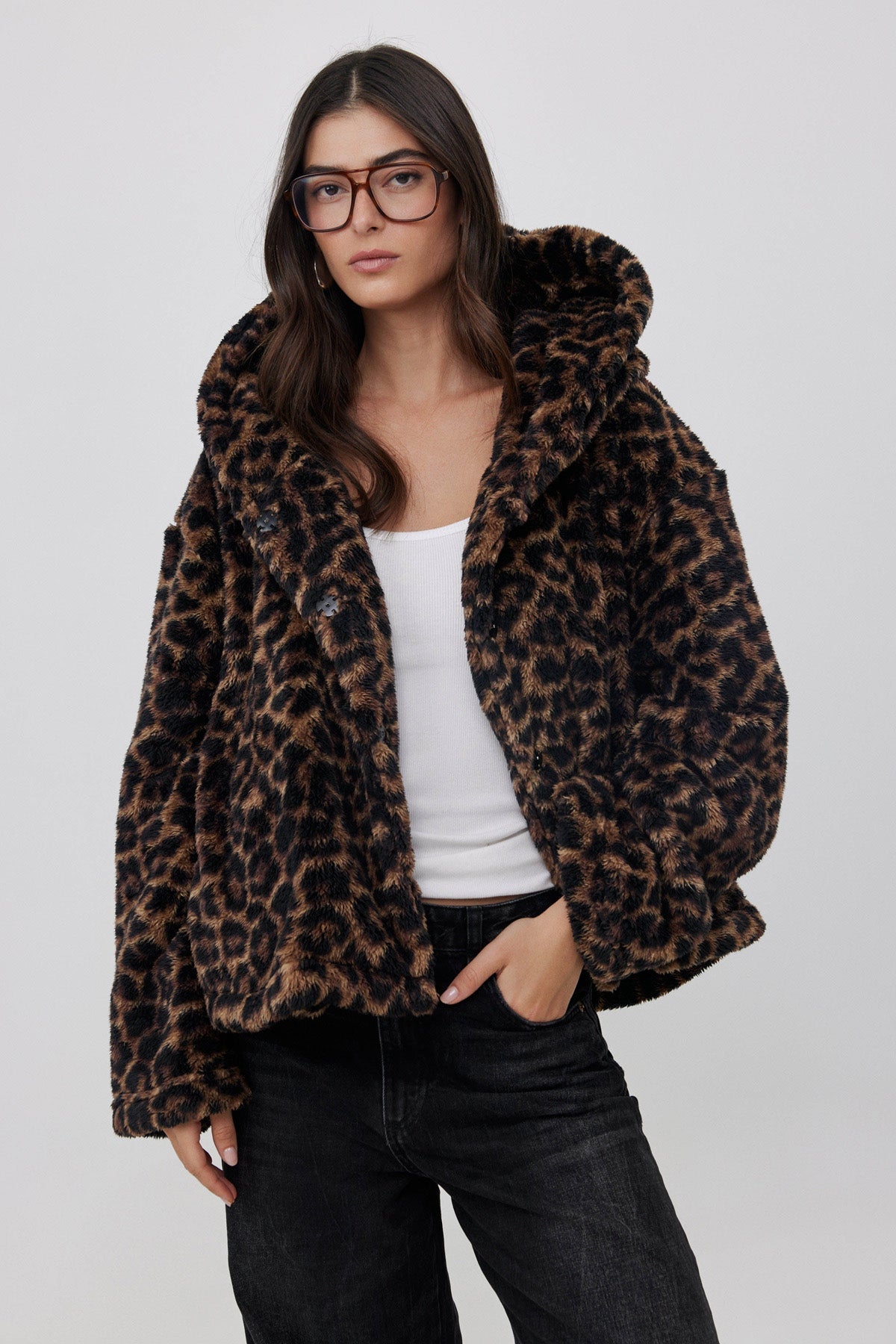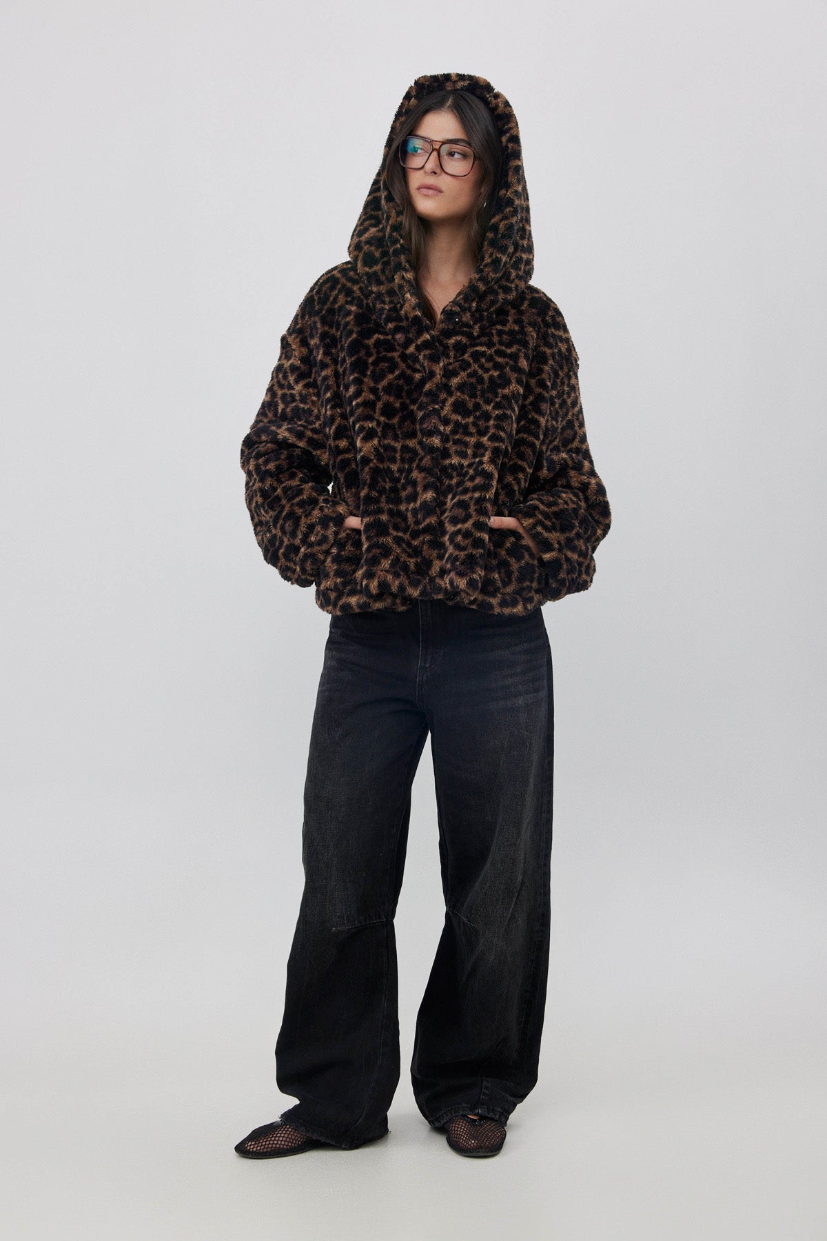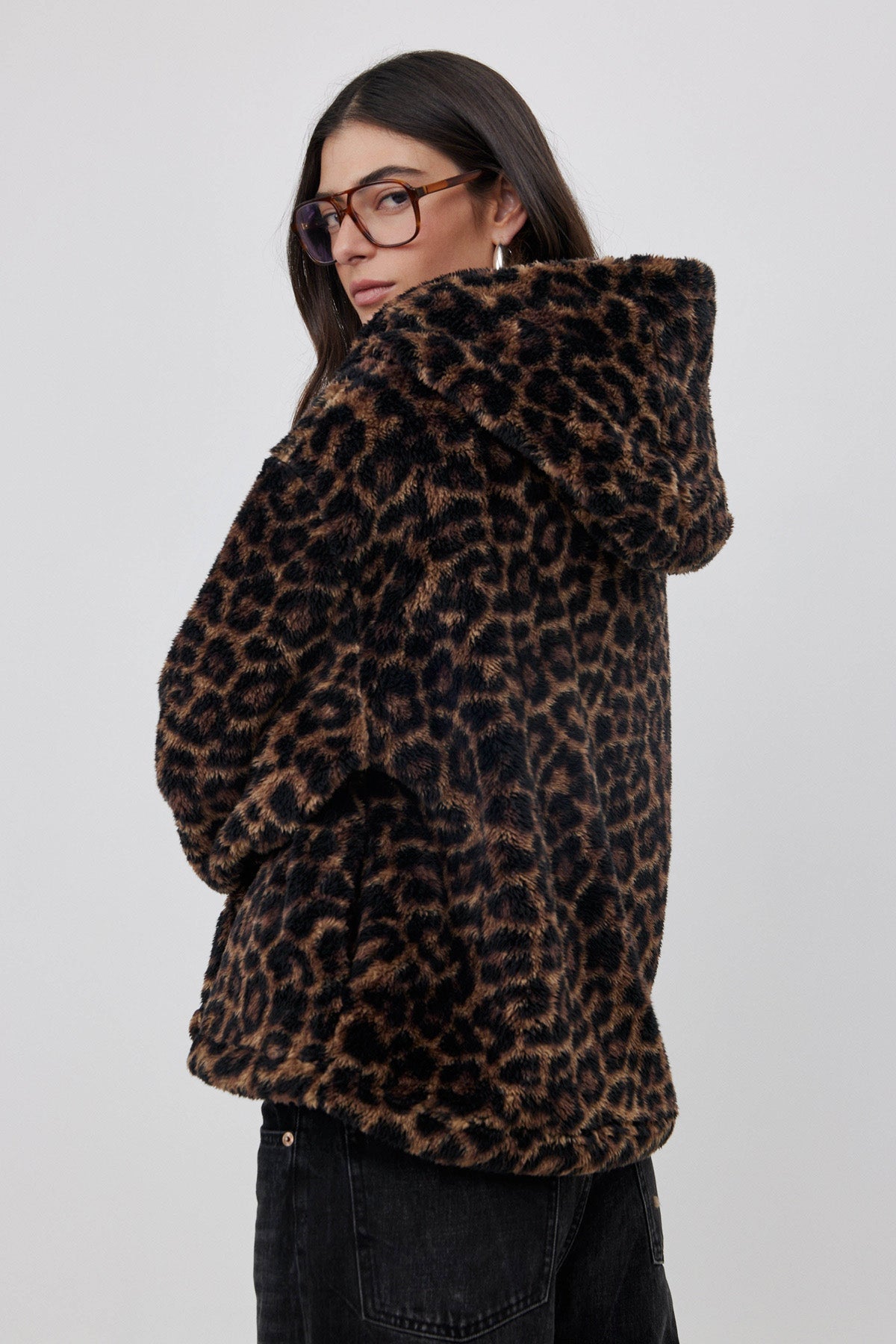 SHORT FLEECE JACKET WITH HOODIE IN ANIMAL PRINT