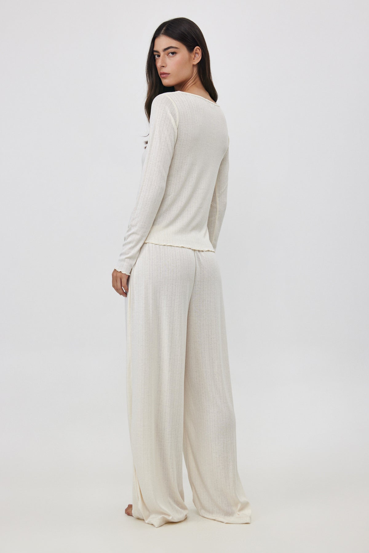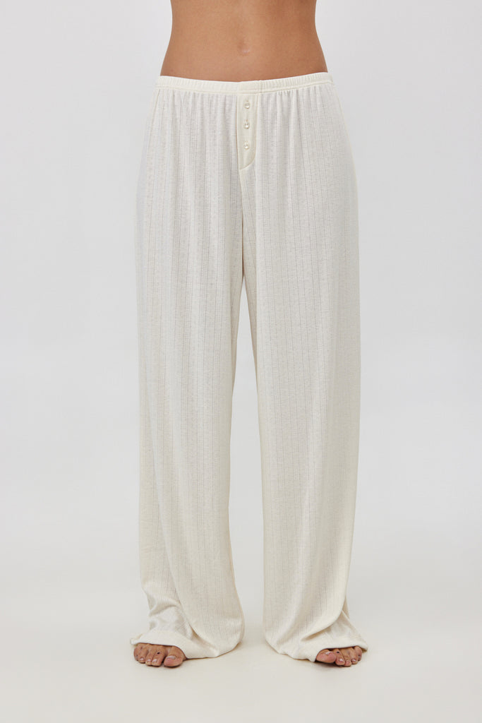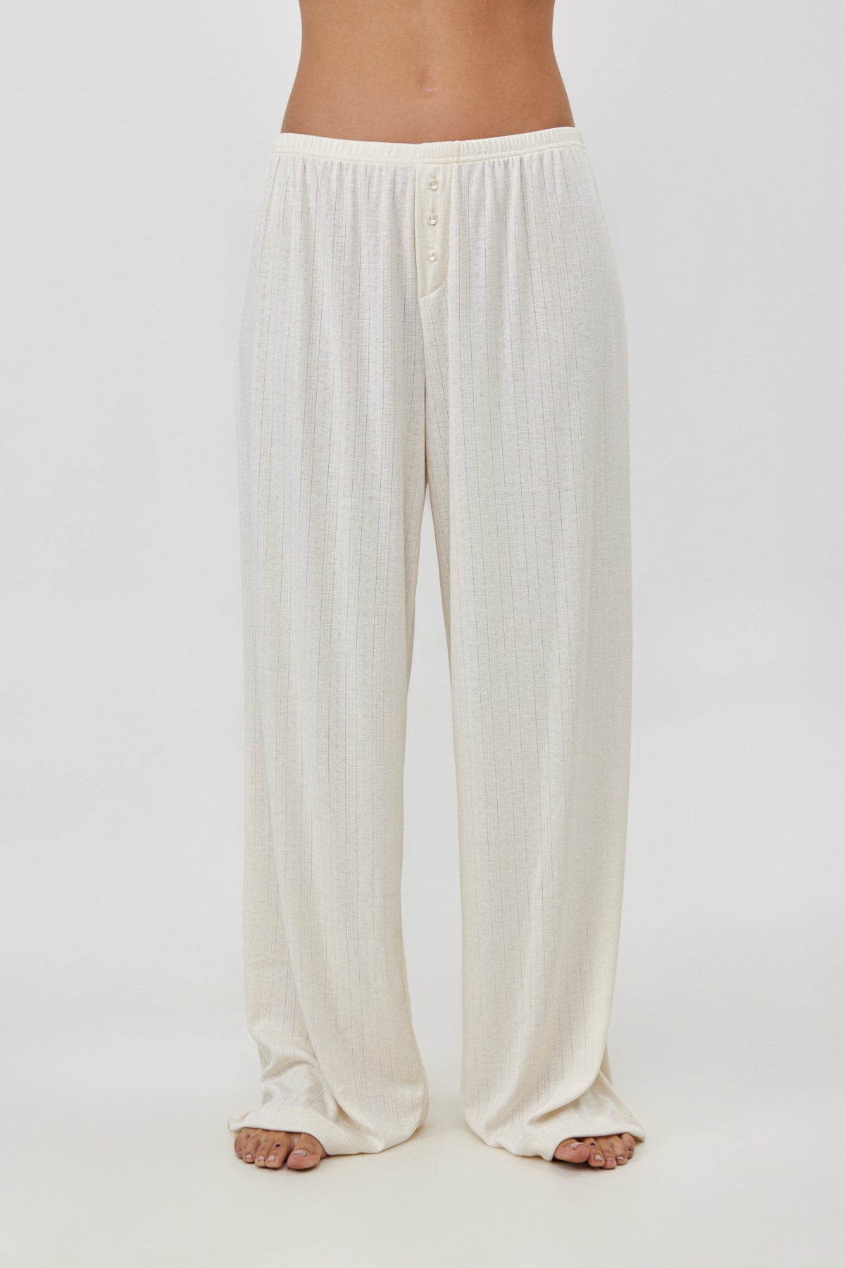 • Embrace effortless elegance with these soft pointelle knit wide-leg pants, featuring a high-rise elastic waistband and charming decorative front buttons for a stylish touch